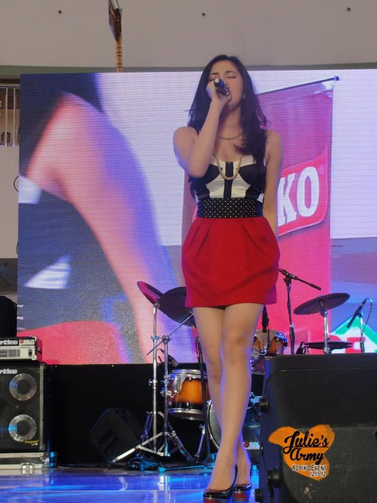 Julie definitely looked Christmas-y last Saturday with her outfit of red, white, and gold. She sang for the Kopiko Christmas event at SM Fairview then. She sang a number of songs, and did an awesome eight-minute song medley that we embedded below. It's been quite a time since she did that, so thank you, baby girl! ;)